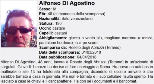 Quest'ultima ha colpito i telespettatori per la differenza di età fra l'uomo e la sua compagna, che ha detto: «Alfonso mi ha fatto tornare giovane, mi ha reso felice, andavamo sempre al mare insieme, eravamo come due ragazzi. [...] Lui aveva il vizio maledetto di bere, ma poi si è disintossicato. Era felice e contento». Secondo l'analisi delle celle telefoniche Alfonso o una persona col suo cellulare si aggirerebbe spesso in zona Termini a Roma.