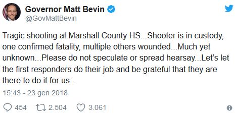 Il Governatore Matt Bevin ha pubblicato un tweet asserendo che l'aggressore è stato arrestato.